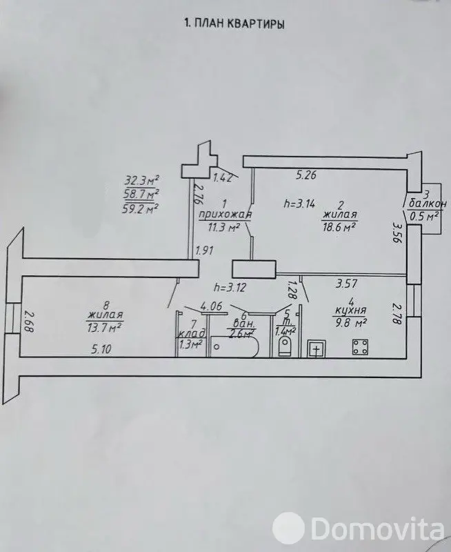 - Общая площадь: 58,7 м²