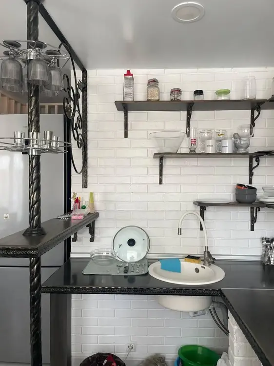 Остается по мебели встроенная кухня, холодильник, духовой шкаф, газовая варочная панель, вытяжка.