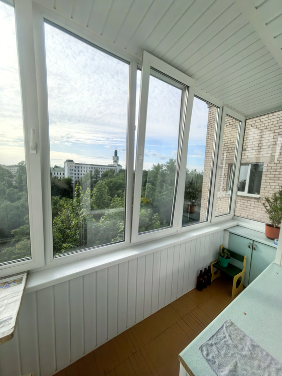 Одна из лоджий застеклена ПВХ (обшита, утеплена), вторая лоджия имеет остекление металлопрофилем (обшита вагонкой, утеплена).