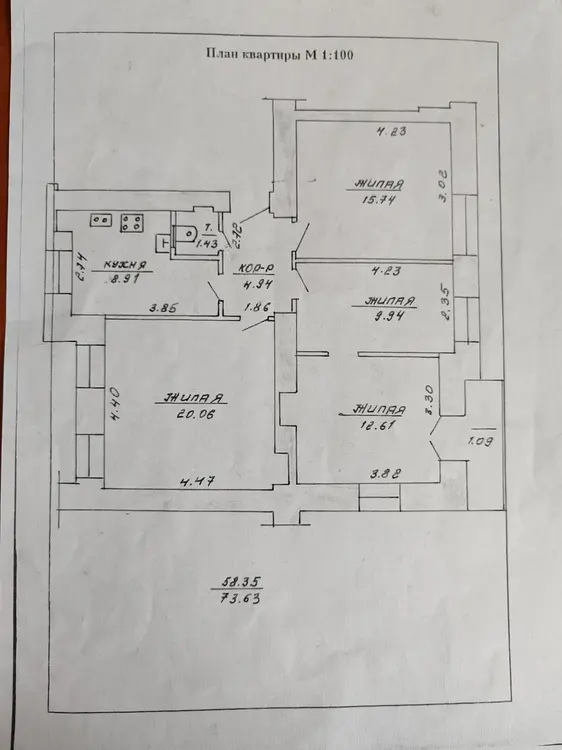 Квартира общей площадью 73,63 кв.м. находится на 3 этаже 4 этажного дома.