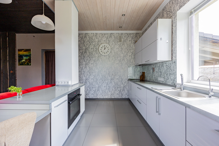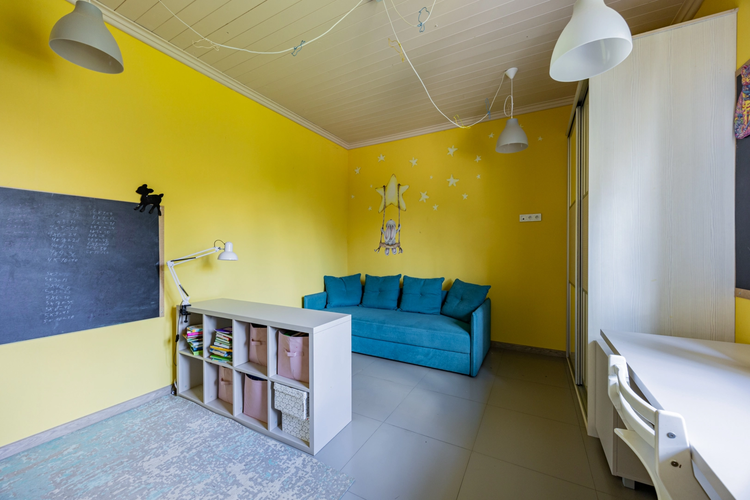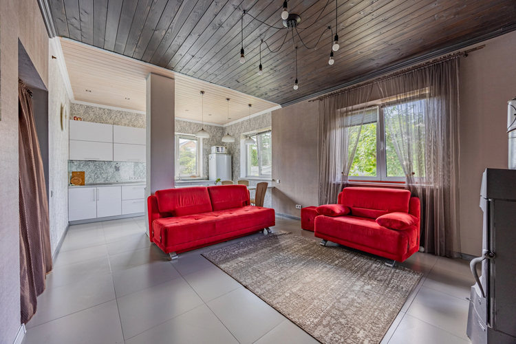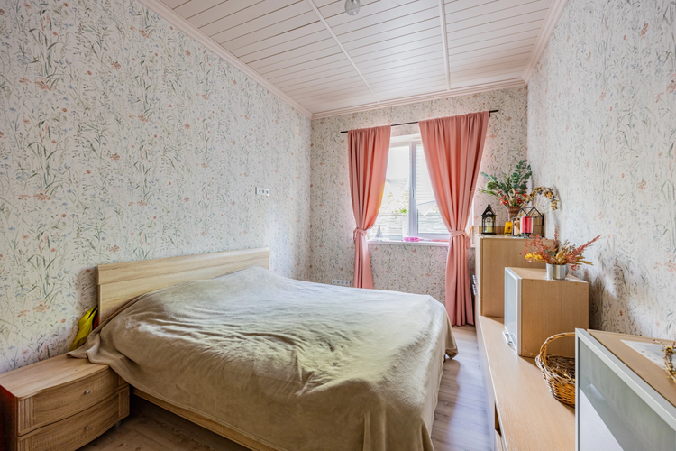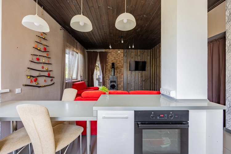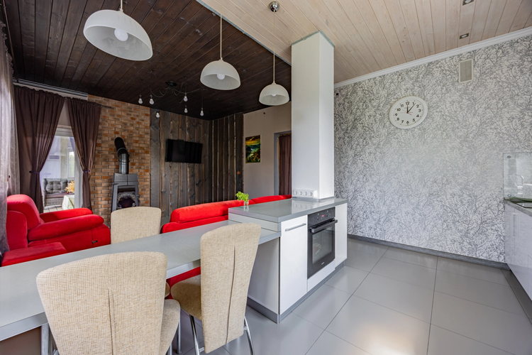 Внутри — две отдельные комнаты и просторная кухня-гостиная с камином, из которой есть выход на уютную террасу. Дом отапливается электрической установкой, по всему дому смонтированы тёплые полы. Есть вместительная гардеробная для удобного хранения вещей.
