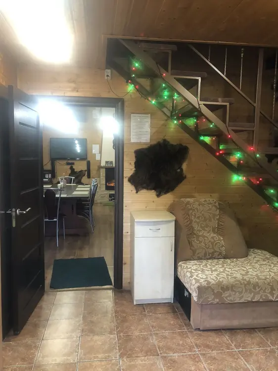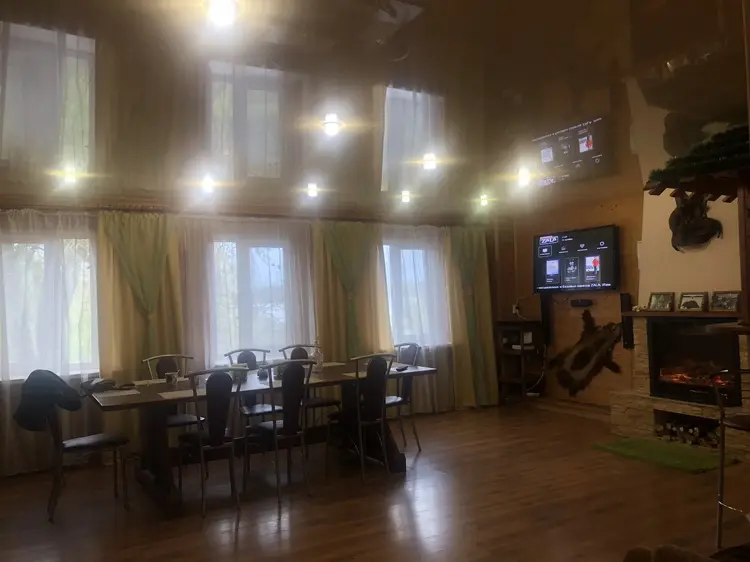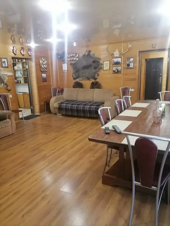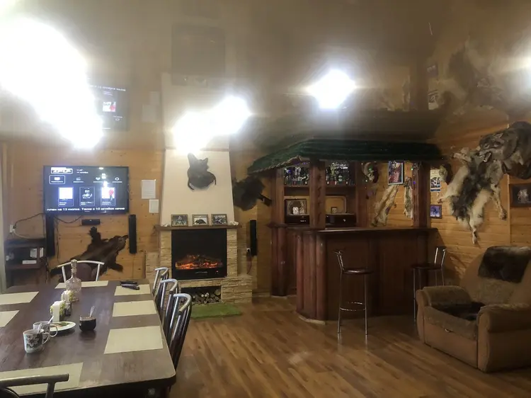 В гостевом доме со всеми удобствами комфортно можно разместить 10 человек. На 1-м этаже расположен зал с камином, оригинально оформленный трофеями диких животных, кухня, оснащённая всей необходимой бытовой техникой, санузел. На 2-м - 4 спальни (каждая на 2 человека) с санузлами.