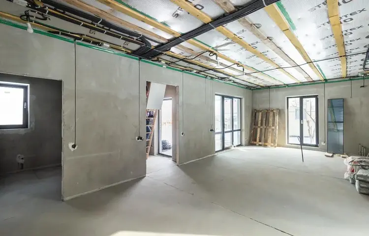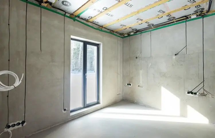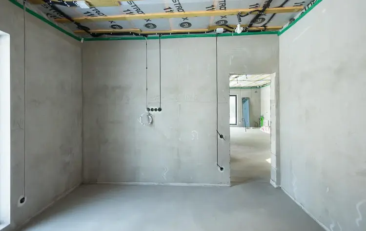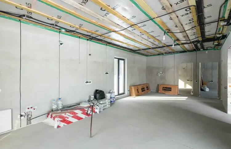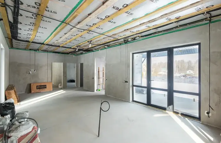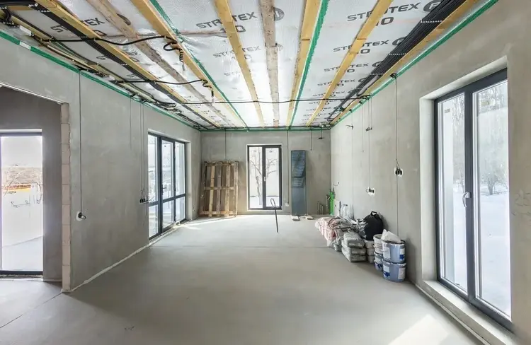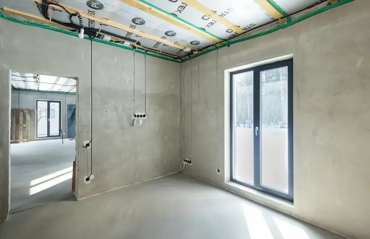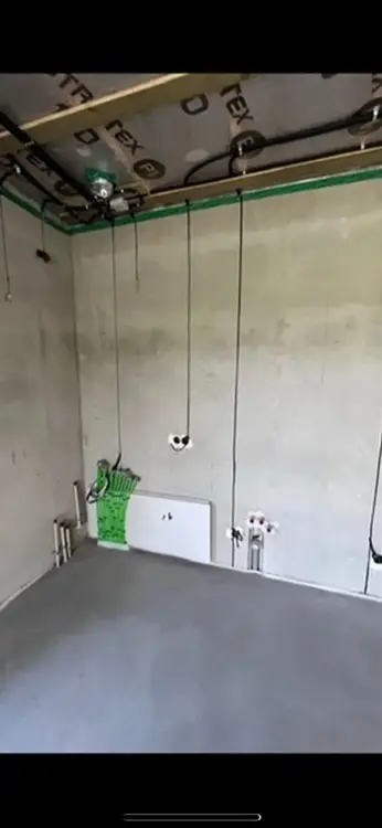 В доме проведены основные "грязные" работы связанные со штроблением, утеплением и черновой штукатуркой стен.
