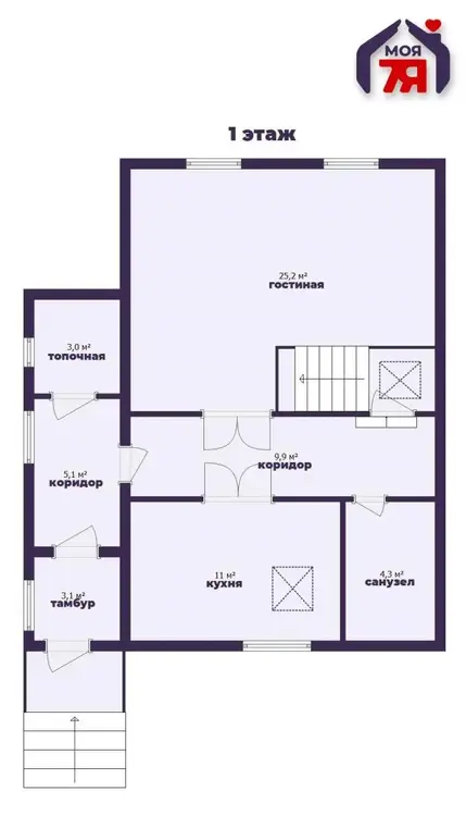 - На первом этаже расположены уютная гостиная, функциональная кухня с новой техникой и стильным фартуком, санузел и хозяйственные помещения.