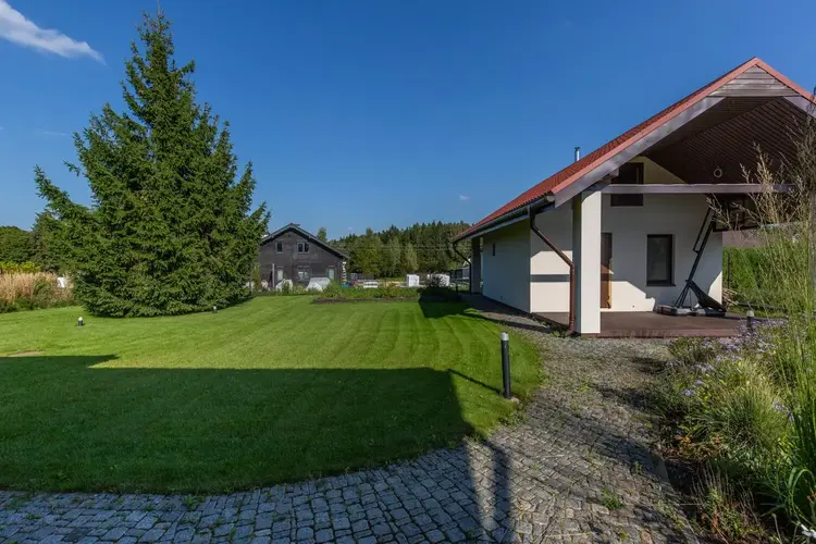 Профессиональный ландшафтный дизайн включает живую изгородь (грабы, пузыреплодник), взрослую ель, управляемую систему автополива газона и грядок, цветники с многолетними растениями. Система автополива снабжена датчиками дождя. Газон – ровный, ухоженный. Достопримечательность территории – взрослая ель (пушистая, высокая, правильной формы, с возможностью подстветки - отличное украшение, в том числе на новый год). Дорожки и площадка для авто вымощены гранитной брусчаткой.