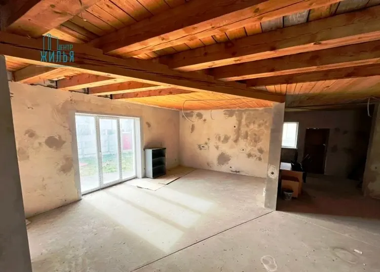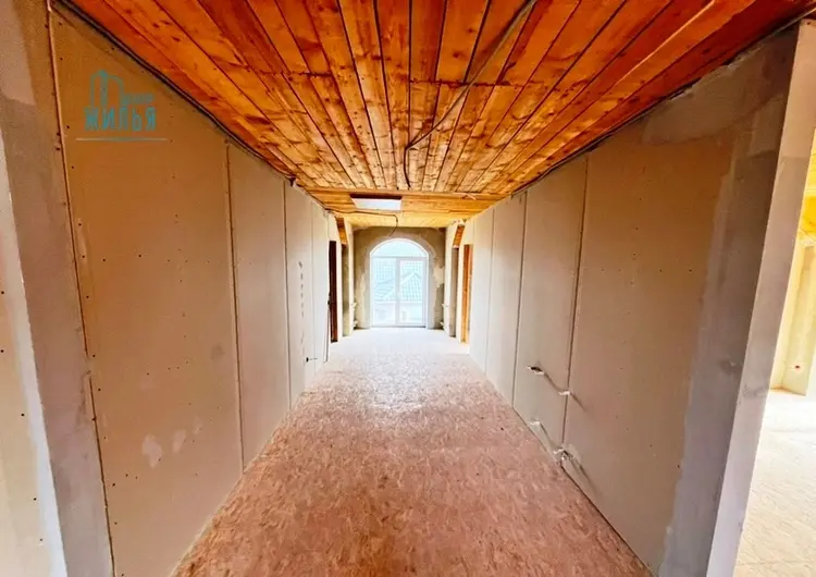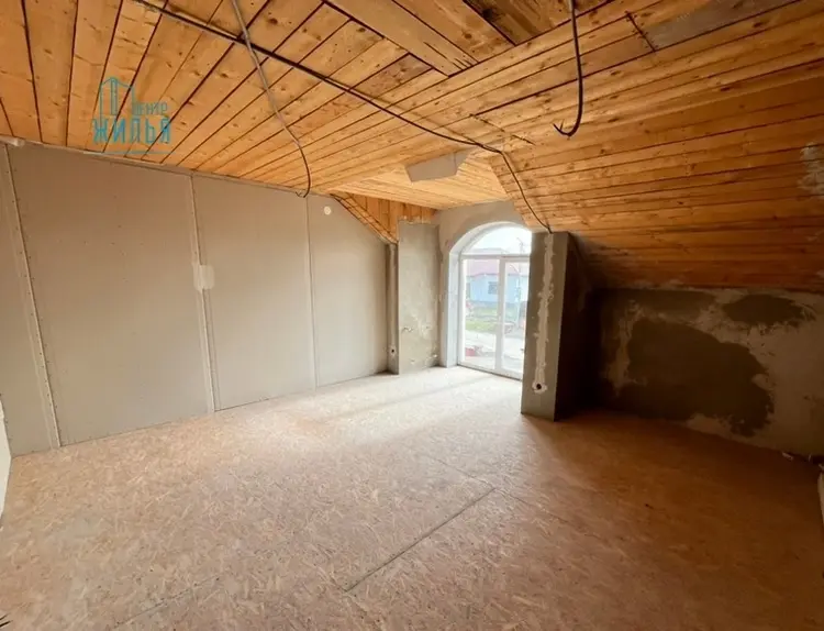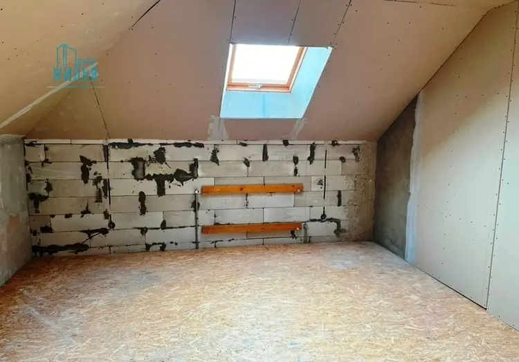 Первый этаж оштукатурен, залита чистовая стяжка. Мансардный этаж утеплен, обшит гипсокартоном, на полу уложена ОСБ-плита.