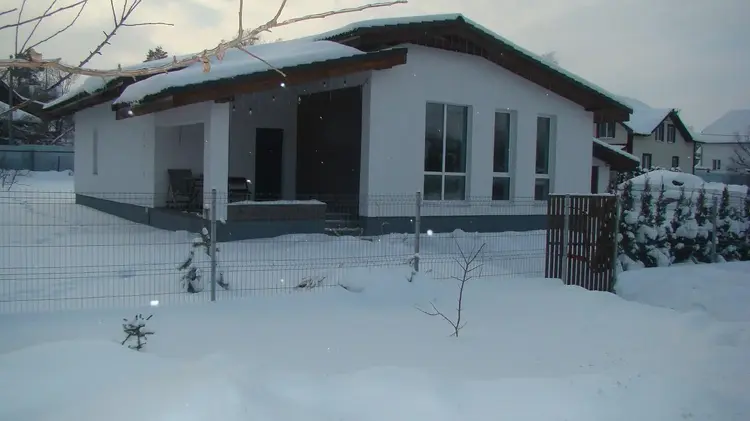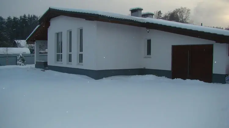Наружная отделка: термошуба толщиной 50мм, с декоративной штукатуркой по типу «корник», финишная покраска.