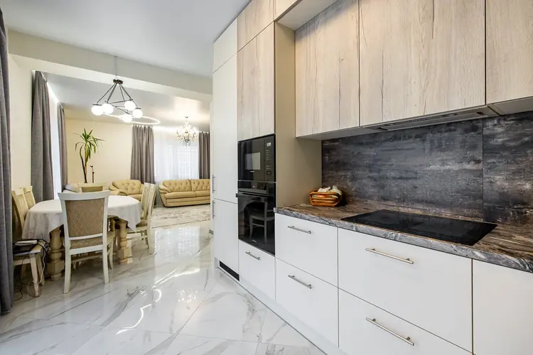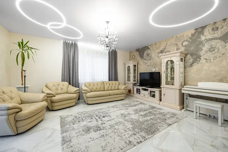 Коммуникации: электричество, газ, центральный водопровод, местная канализация-переливная на 3 резервуара. Дом в 2 этажа. На первом расположена прихожая, гостиная с кухней, комната, топочная и санузел. На втором этаже 3 комнаты и санузел. Лестница из массива дуба. Теплые полы. Мебель и техника остаются новому собственнику по договоренности.