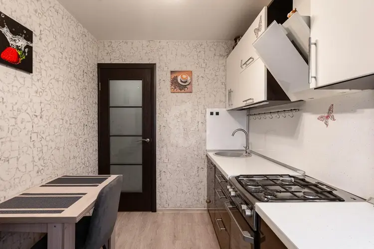 Кухня 6.1 кв.м. Аккуратный мебельный гарнитур. На кухне установлена стиральная машина.