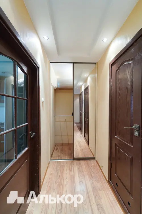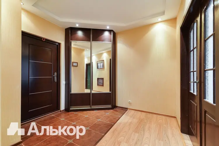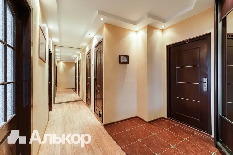 Потолки окрашены. На полу ламинат. В зоне прихожей, на кухне и в санузлах плитка. Раздельный санузел. Металлическая входная дверь.
