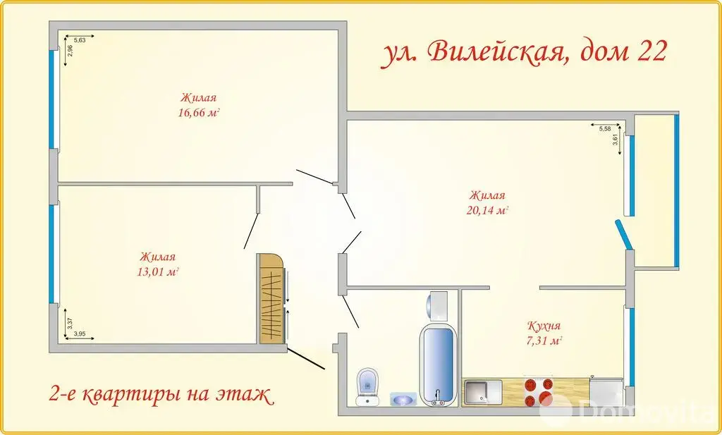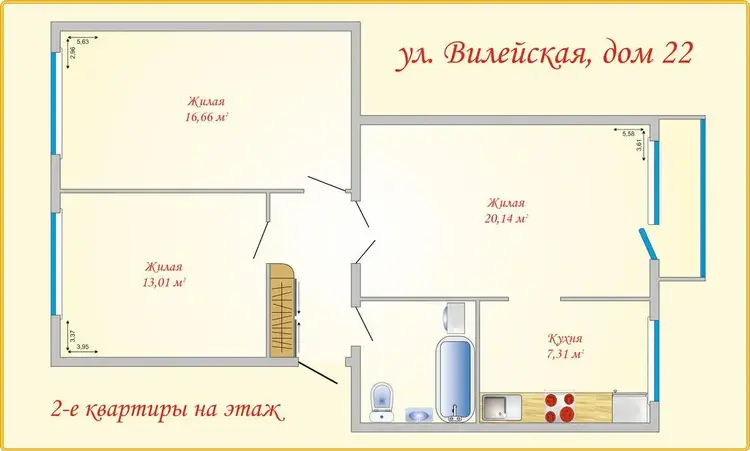 Дом из кирпича, надёжный и тёплый. На лестничной площадке — по 2 квартиры.