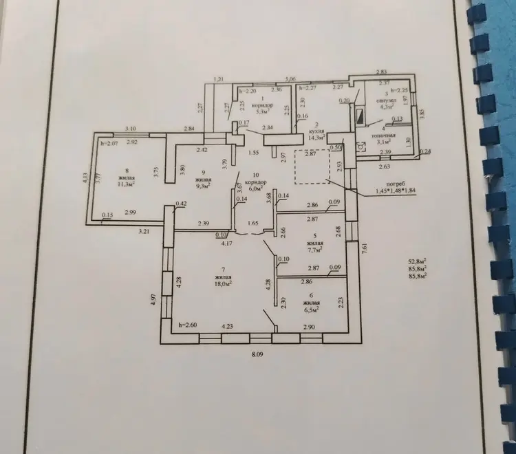 Общая площадь дома составляет 85,8 м², жилая площадь – 52,8 м², а кухня – 14,3 м². В доме установлено газовое отопление и двухконтурный котел, что обеспечивает тепло и комфорт в любое время года. Центральное водоснабжение и новая местная канализация делают проживание удобным. Санузел в доме совмещенный и облицован плиткой, что придает ему современный вид. Полы выполнены из ламината и линолеума, а окна частично заменены на ПВХ, что улучшает тепло- и звукоизоляцию.