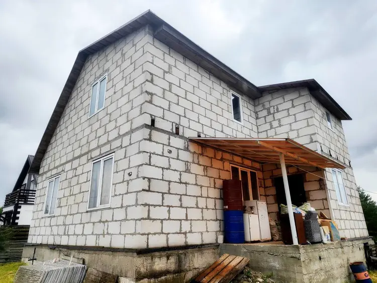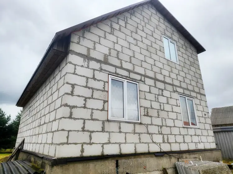 Дом площадью 189,6 м2 с мансардным этажом и большим подвалом выполнен из газосиликатных блоков с двускатной крышей, кровля мягкая черепица.