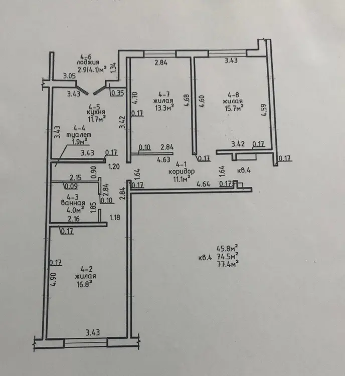 Квартира расположена на 1 этаже. Общая площадь по СНБ составляет 77,4м², жилая площадь — 45,8 м², просторная кухня — 11,7 м². Планировка удачная: прихожая 11,1м², три изолированные комнаты, раздельный санузел, застекленная лоджия. Окна ПВХ выходят на две стороны, потолки натяжные.