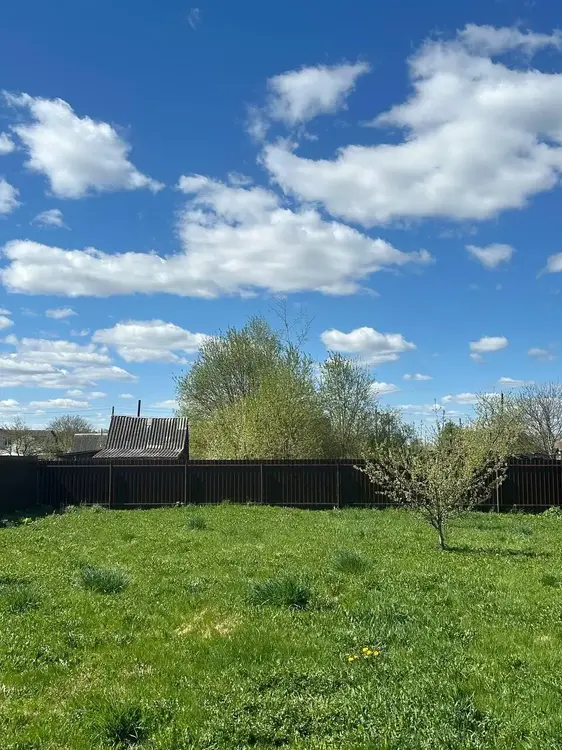 Участок 8.5 соток огорожен забором с металлопрофиля. Газон.
