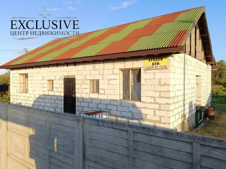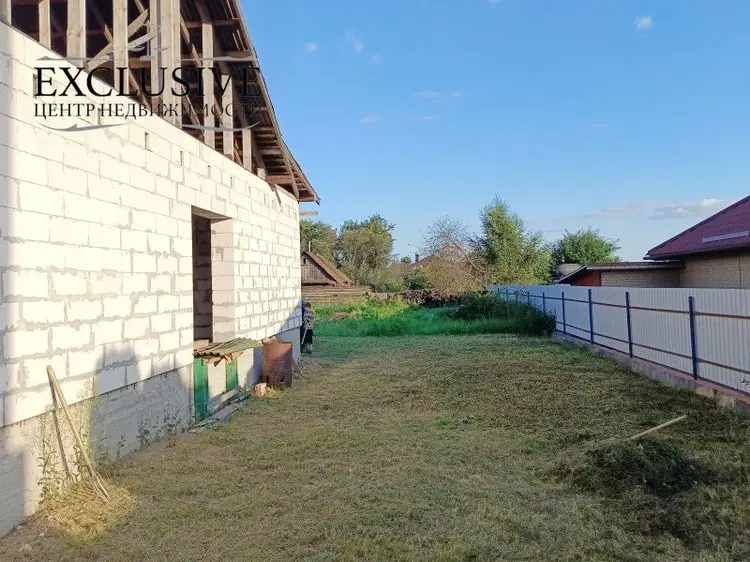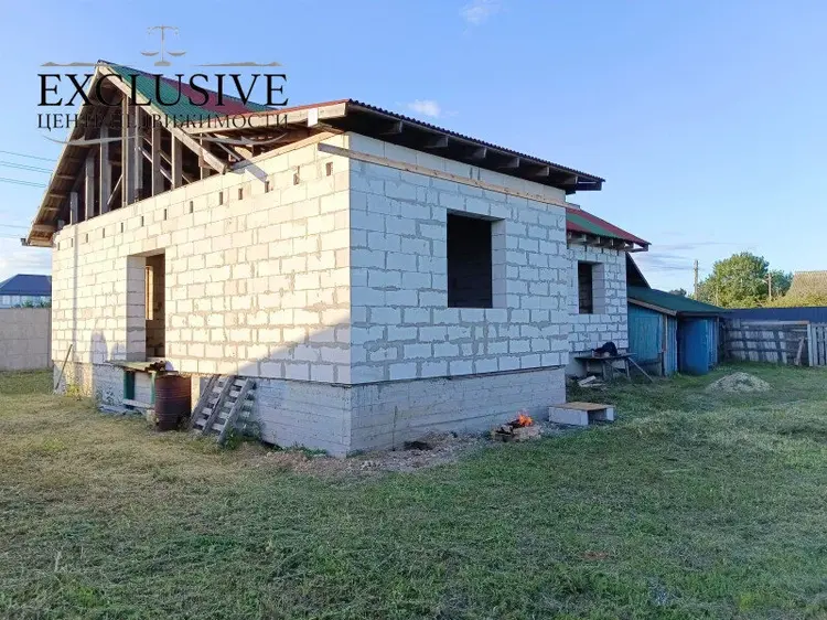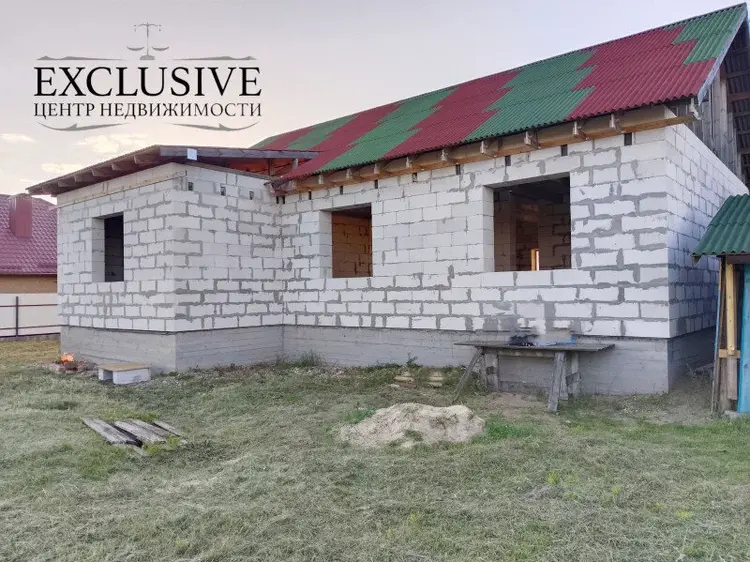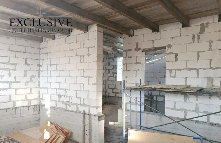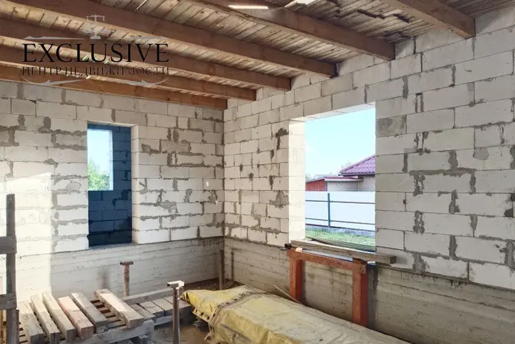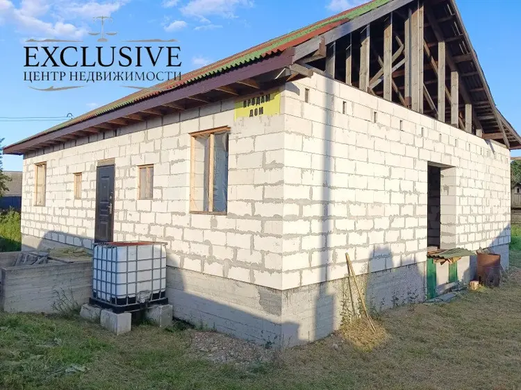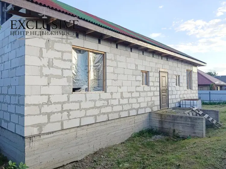 Дом 2020 года постройки, готовность 60%. На высоком свайно-ростверковом фундаменте с армированием, стены из газосиликатных блоков 40 см, крыша - ондулин, перекрытия между первым и мансардным этажом деревянные. Планируемая общая площадь первого этажа 101.2 м.кв., жилая 64,1 м.кв., кухня 7,7 м.кв. с гостиной 25.6 м.кв , два санузла.