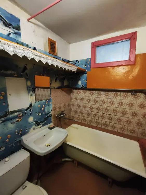 Площадь квартиры общая 42.2, по СНБ - 43м кв Комнаты изолированы 13.4 и 12.6 кв м , кухня 5.9 кв.м. Высота потолков - 2.5 м. Сан узел совмещенный 3 кв м и прихожая 7.3 кв м, есть подвал