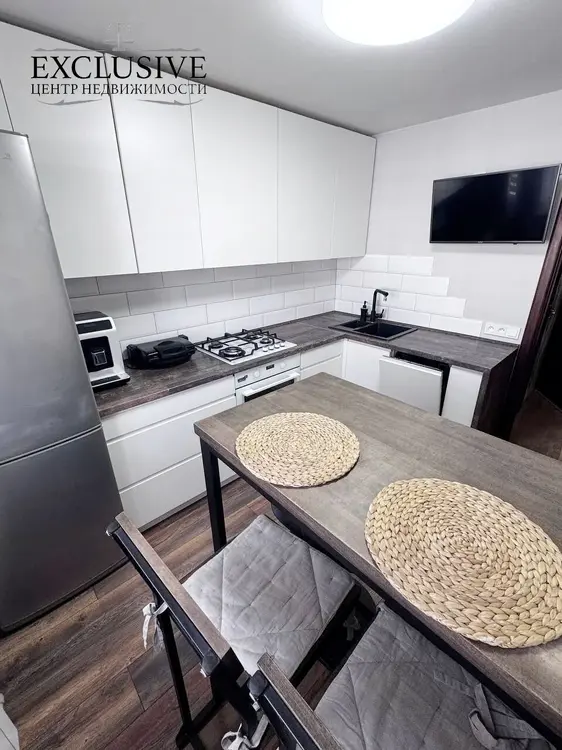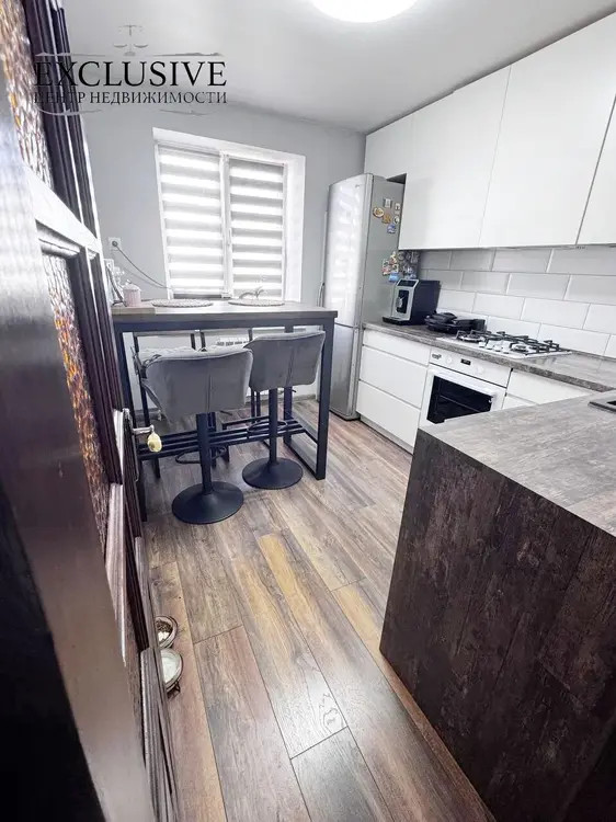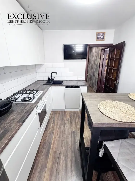 На полу во всей квартире ламинат, натяжные потолки, качественные обои. Современная встроенная кухня с духовным шкафом и посудомойкой.