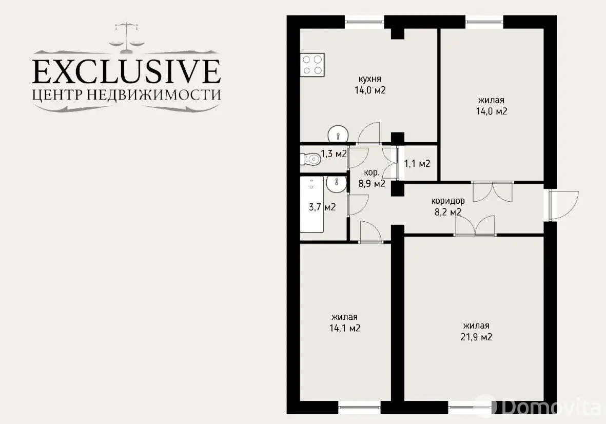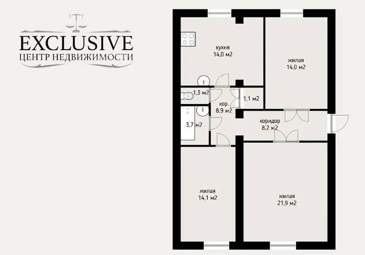 - Функциональная планировка (общая площадь квартиры 82.2 кв., м ) включает 3 изолированные комнаты 21.9 кв.м., 14.1кв.м.. 14.0 кв.м.