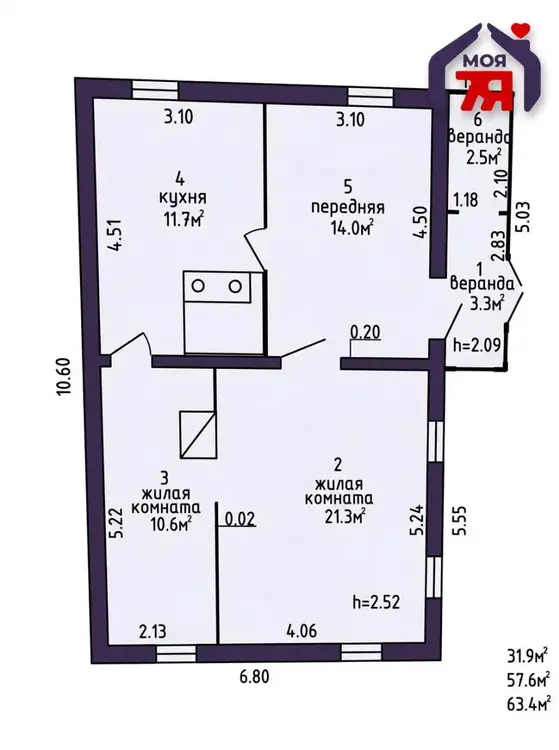 - Общая площадь составляет 63,4 м², жилая площадь — 31,9 м².